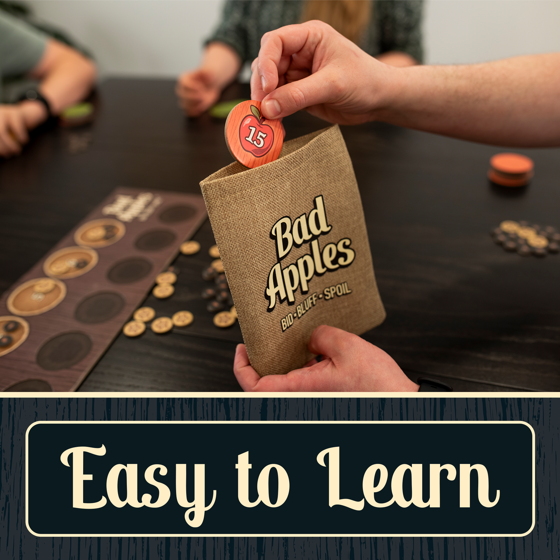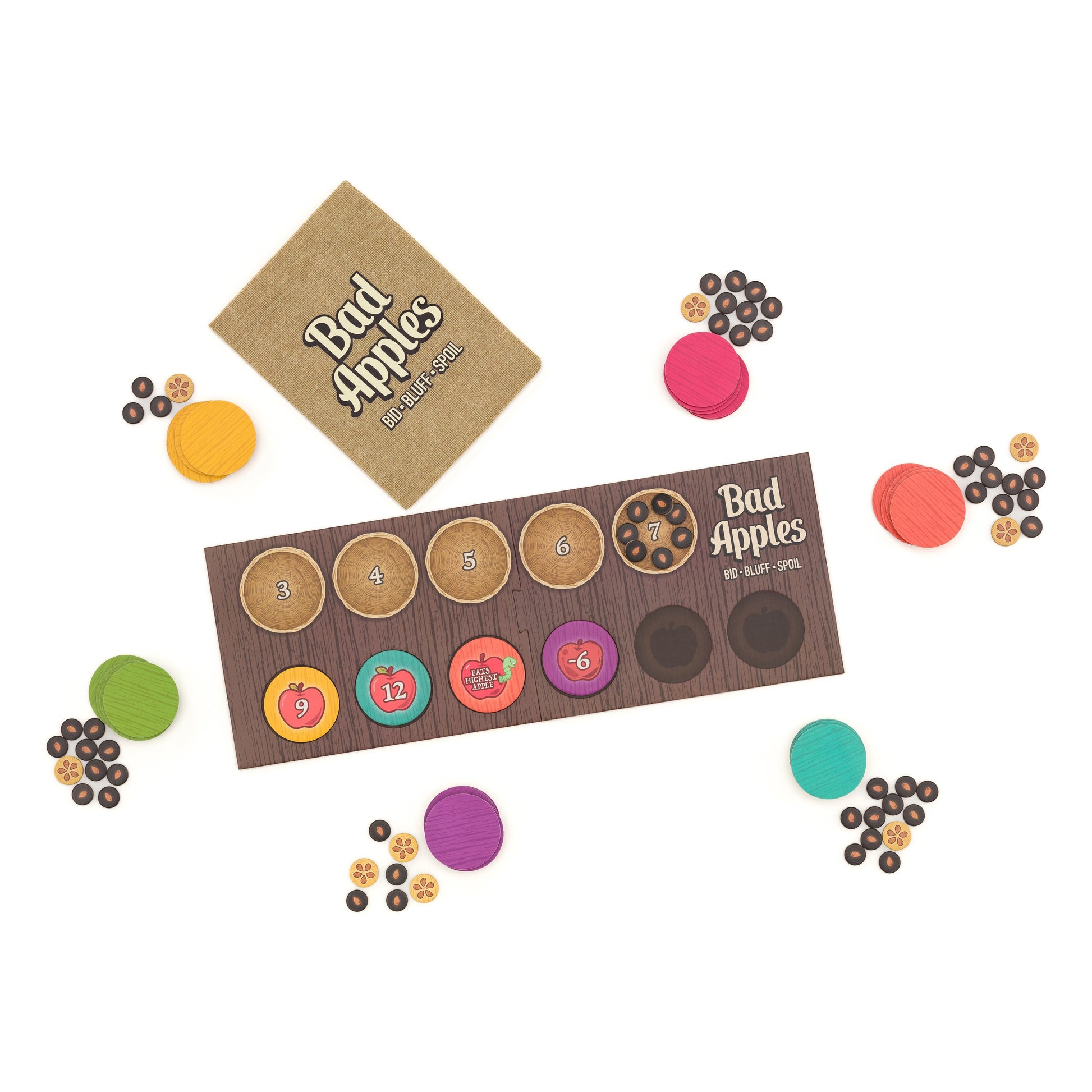 Bad Apples pits bidders, bluffers, and spoilers against one another in a high-stakes auction that reveals the craftiest, most deceptive player at the table. Wager boldly and claim your prize or sabotage your opponents and leave them holding the bag. Are you the baddest of the bunch? Gather your group and find out!