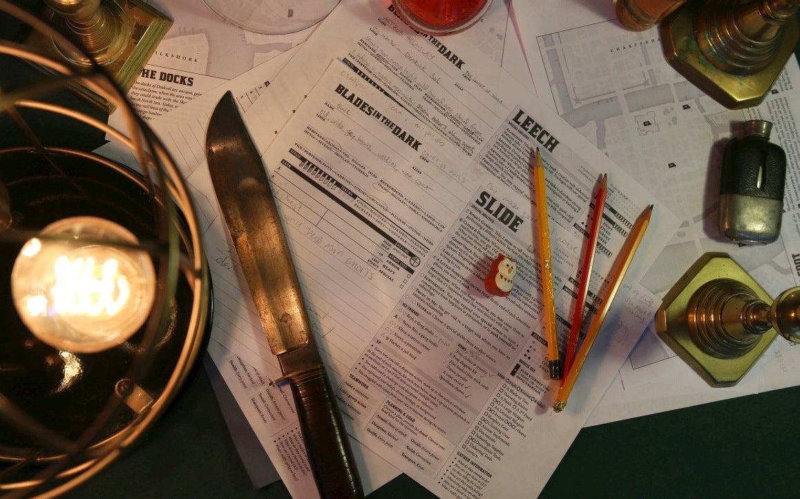 Blades in the Dark is a tabletop role-playing game about a crew of daring scoundrels seeking their fortunes on the haunted streets of an industrial-fantasy city. There are heists, chases, occult mysteries, dangerous bargains, bloody skirmishes, and, above all, riches to be had — if you’re bold enough to seize them.