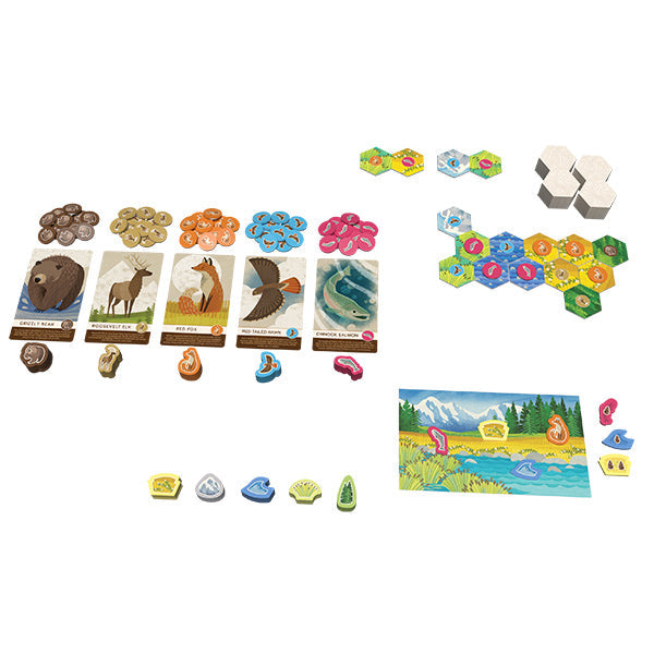 What will you see on your adventure in Cascadia? On your turn, build out your map and match animals and habitats to add sightings to your panorama and score points! Cascadia Junior lets younger players experience the spatial puzzle of the award-winning board game Cascadia! This junior version teaches pattern building, set collection, and basic addition. Learn about bears, elk, foxes, hawks, and salmon in this diverse land of mountains, wetlands, prairies, rivers, and forests!