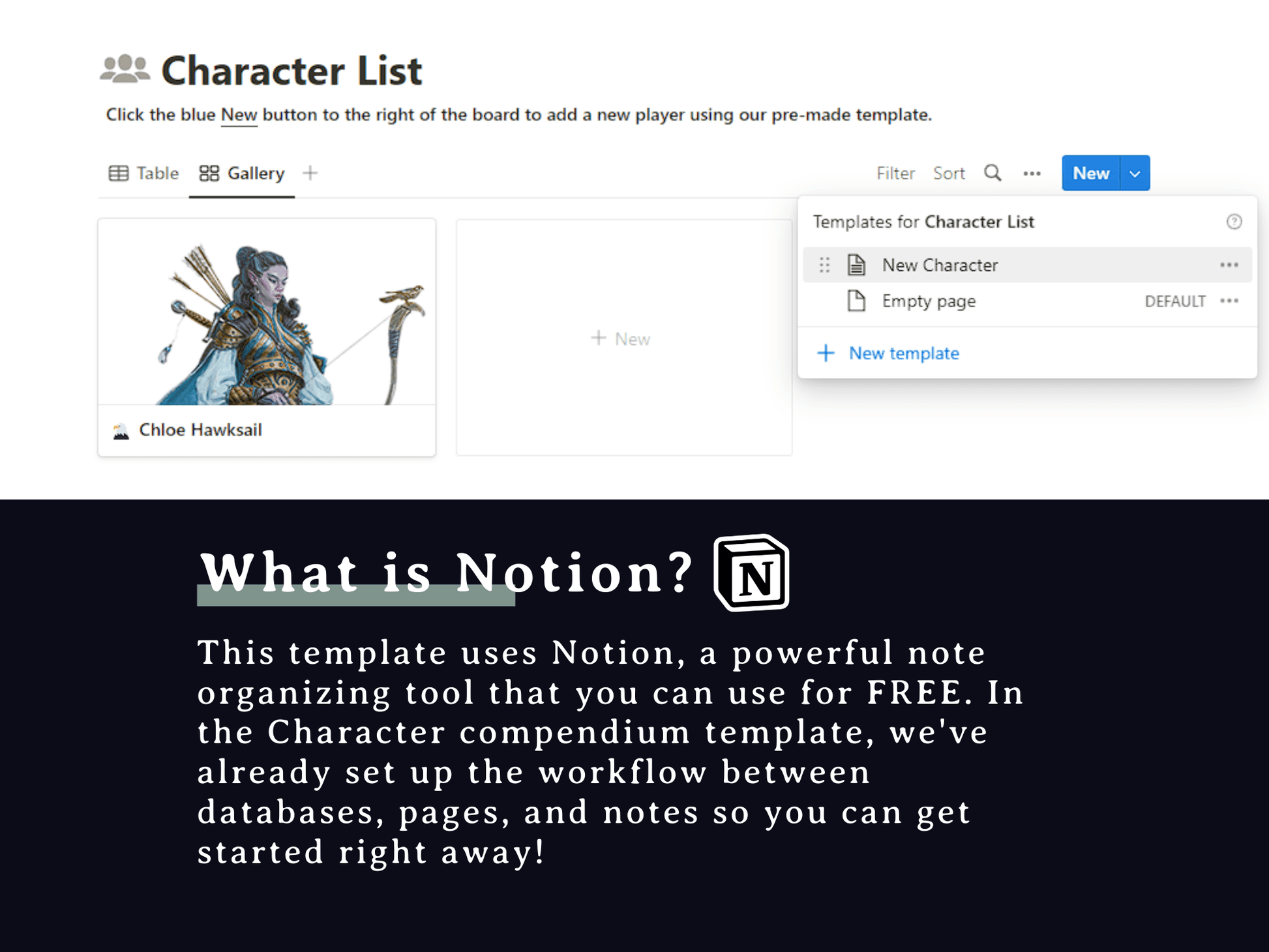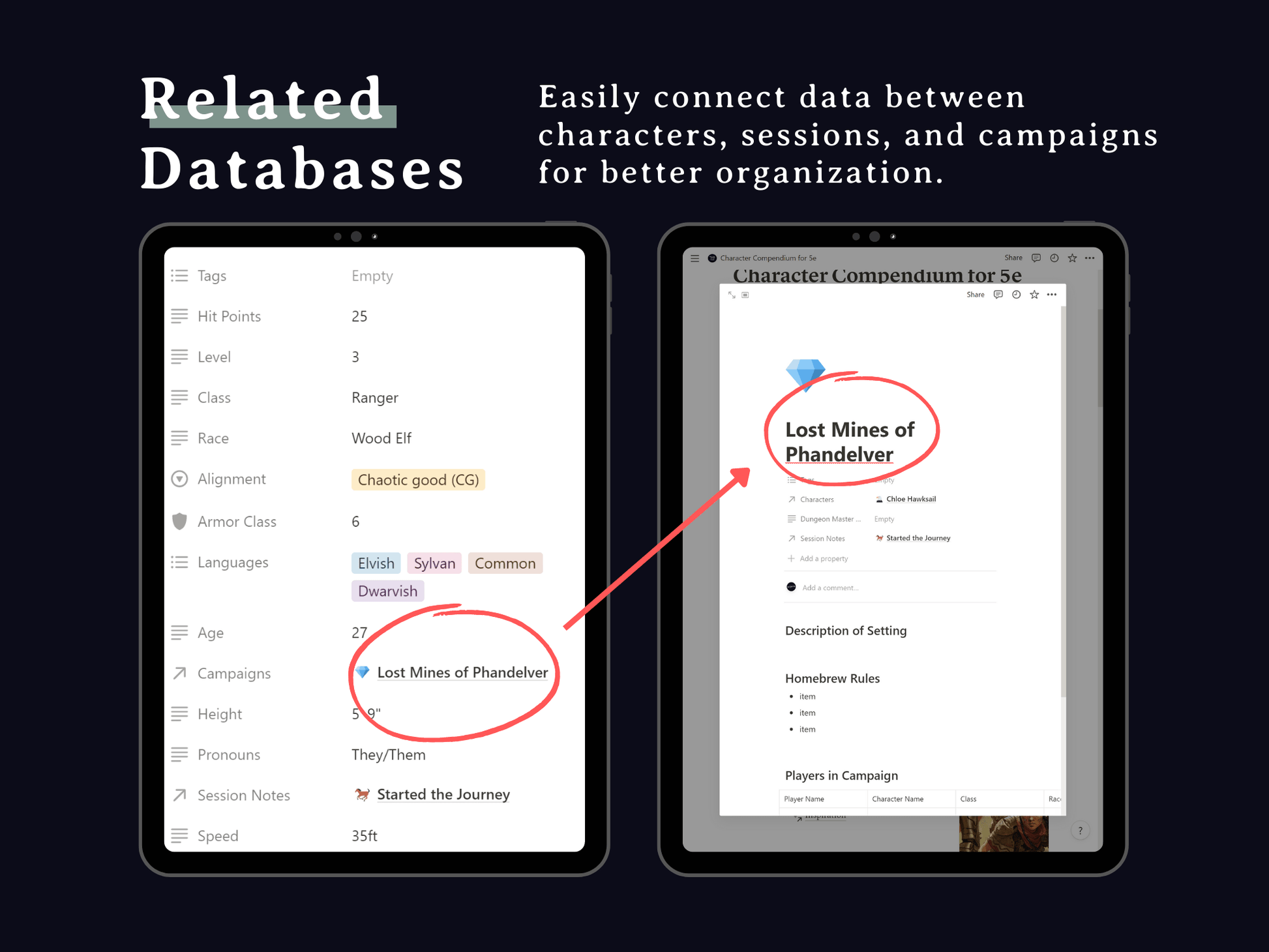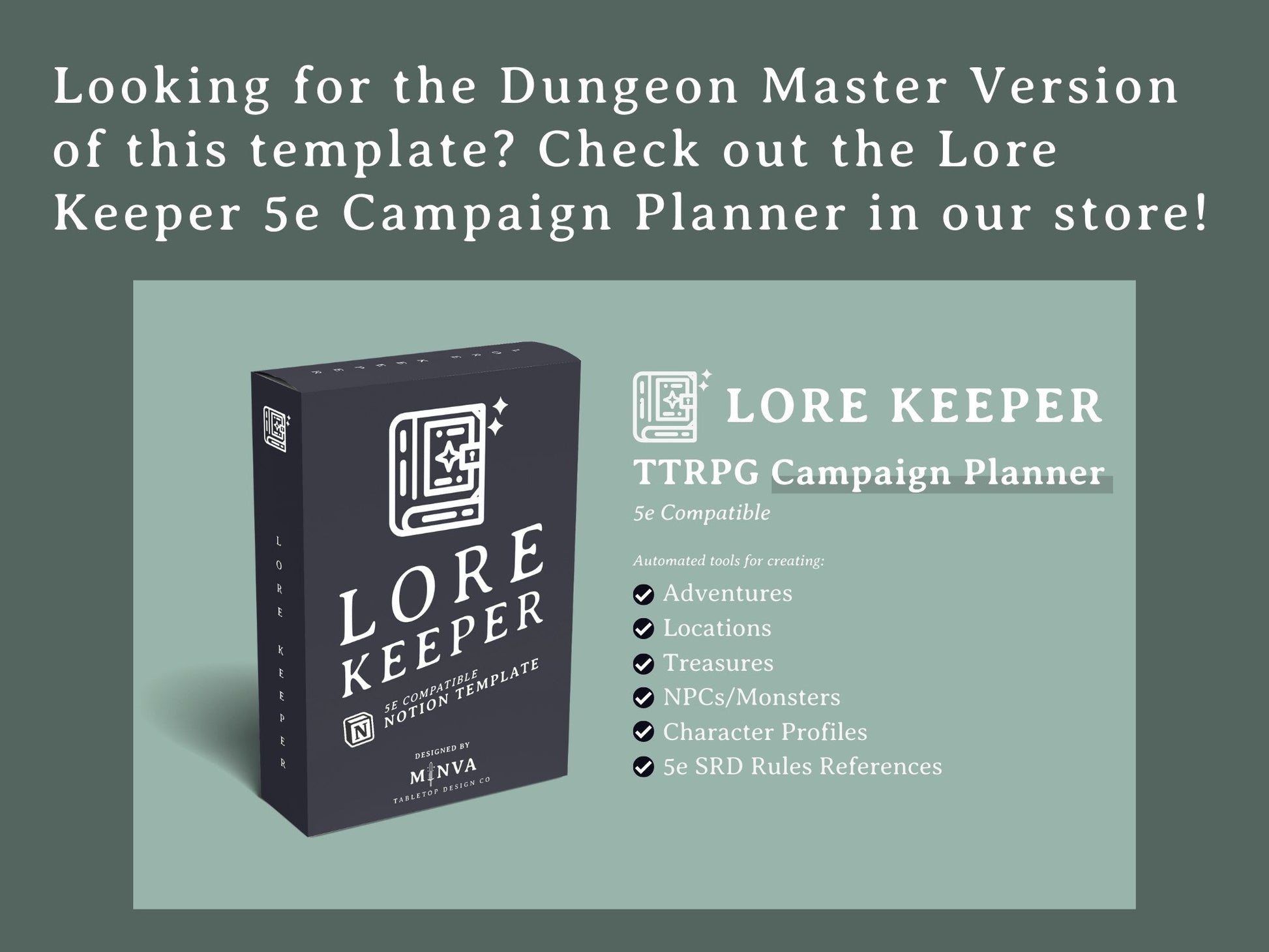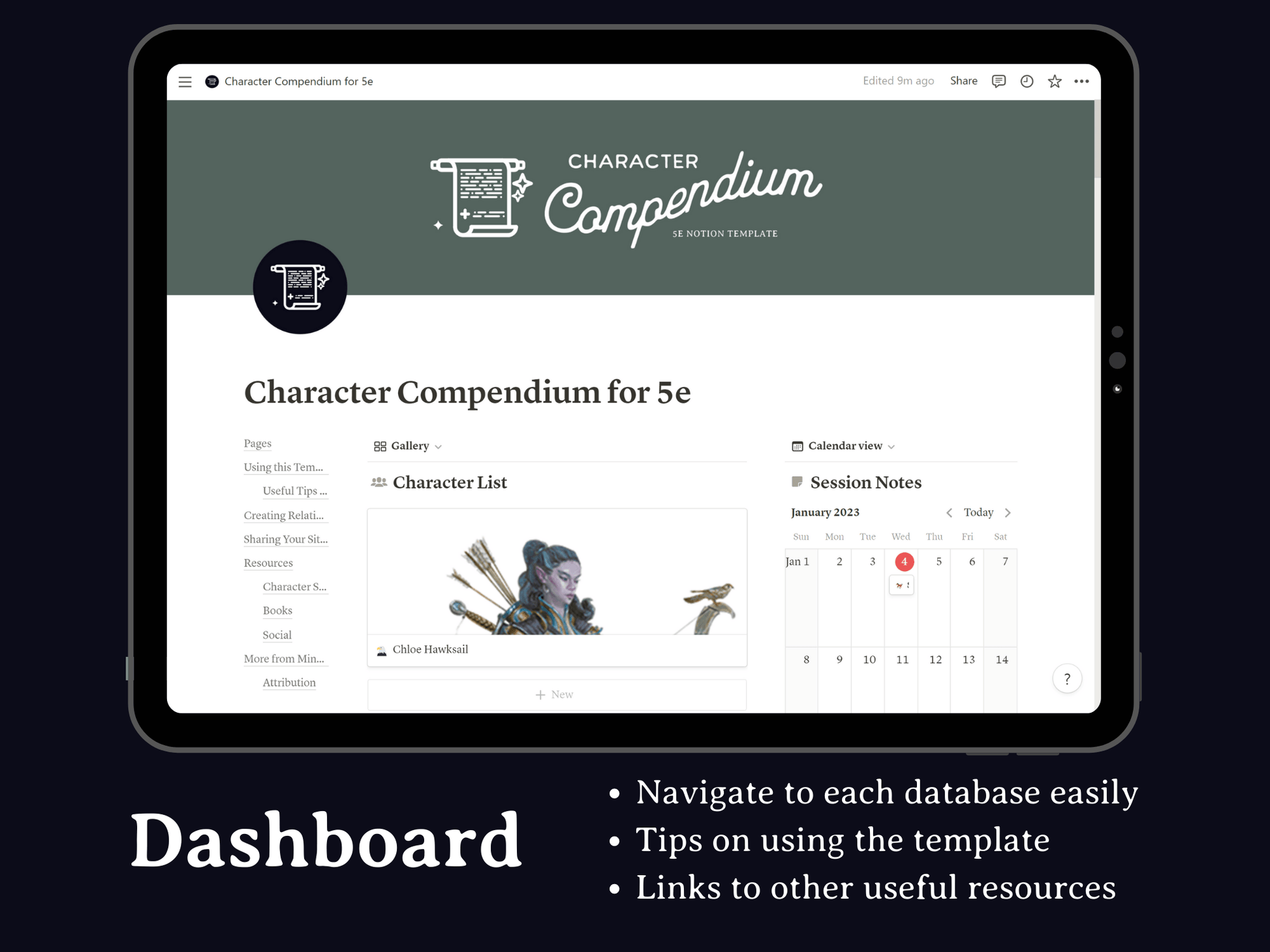 In the Character Compendium 5e Notion Template, you'll find everything you need to keep track of all your characters, campaigns, session notes, and more. Stay organized using our pre-built templates in our databases that link with easier to make it even easier to find