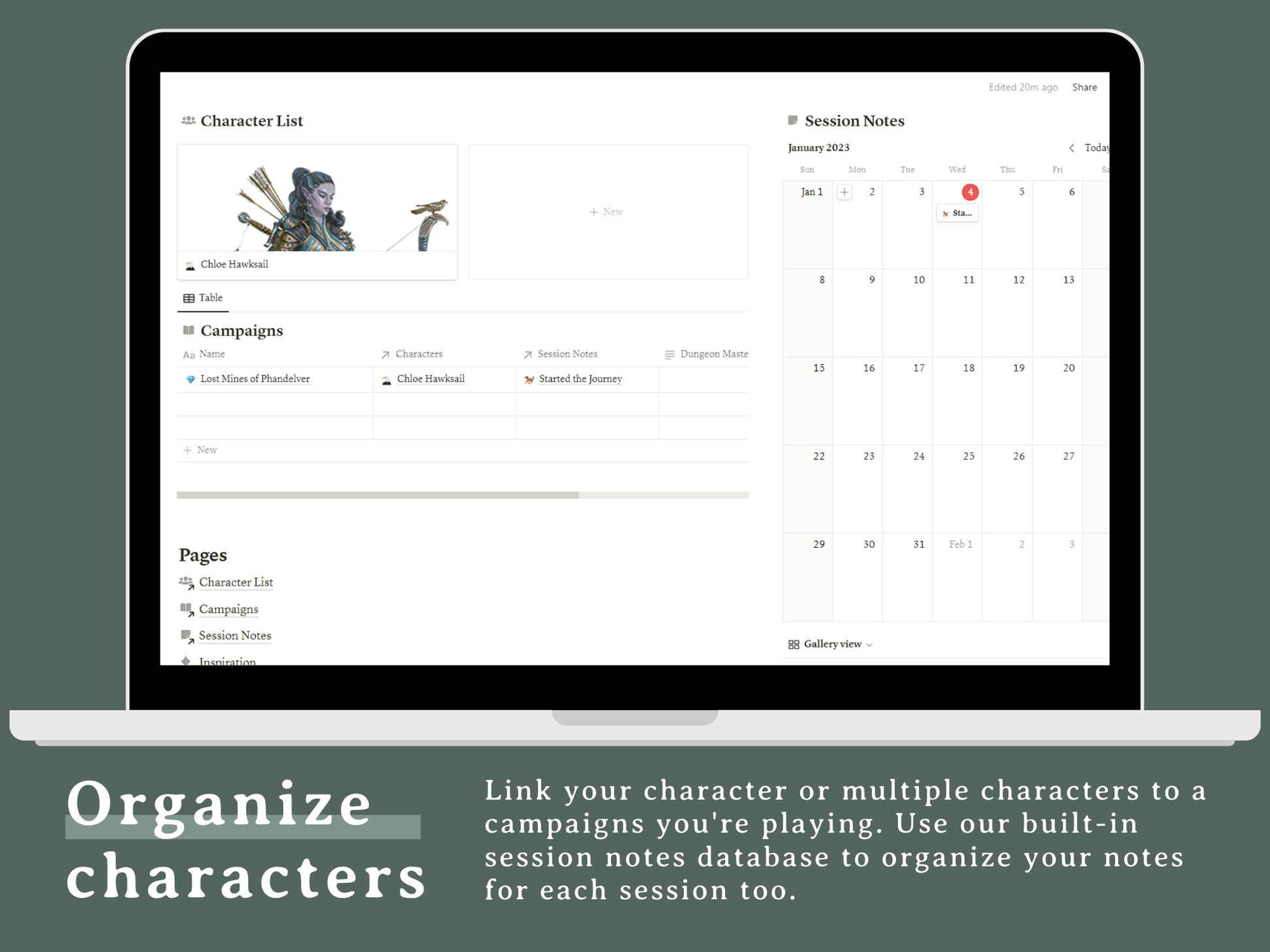 - Databases for Campaigns, Session Notes, and your Characters. All are interconnected with Notion Relation fields for easy referencing.