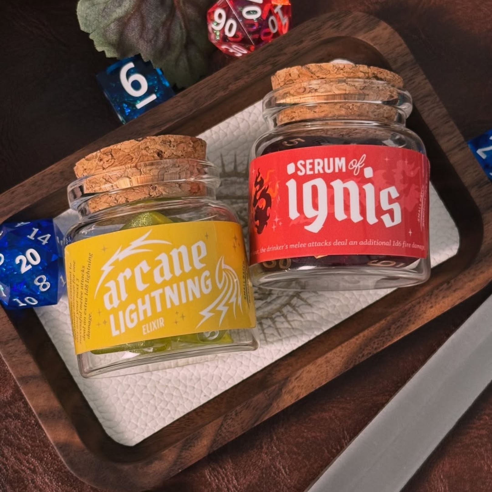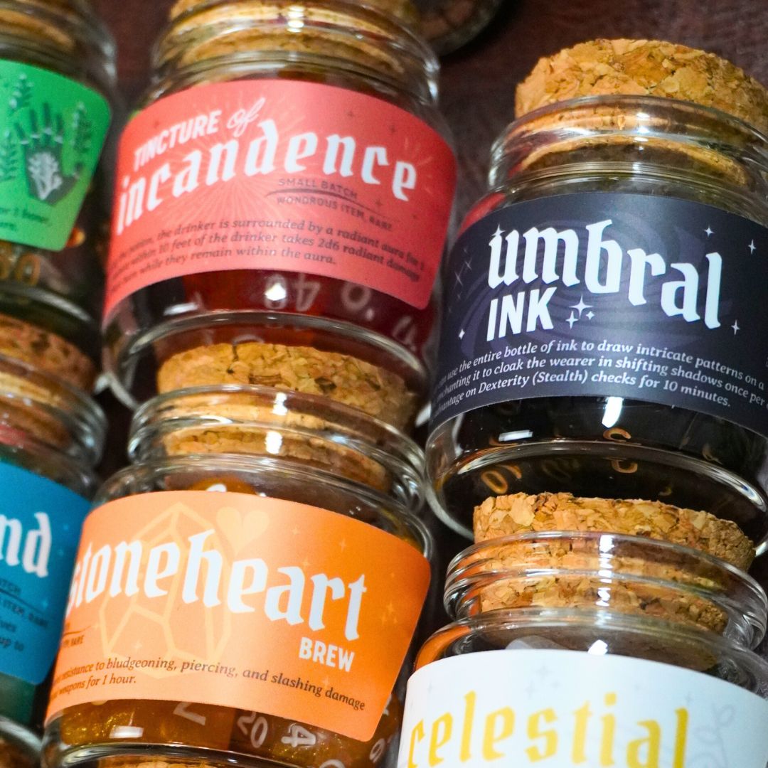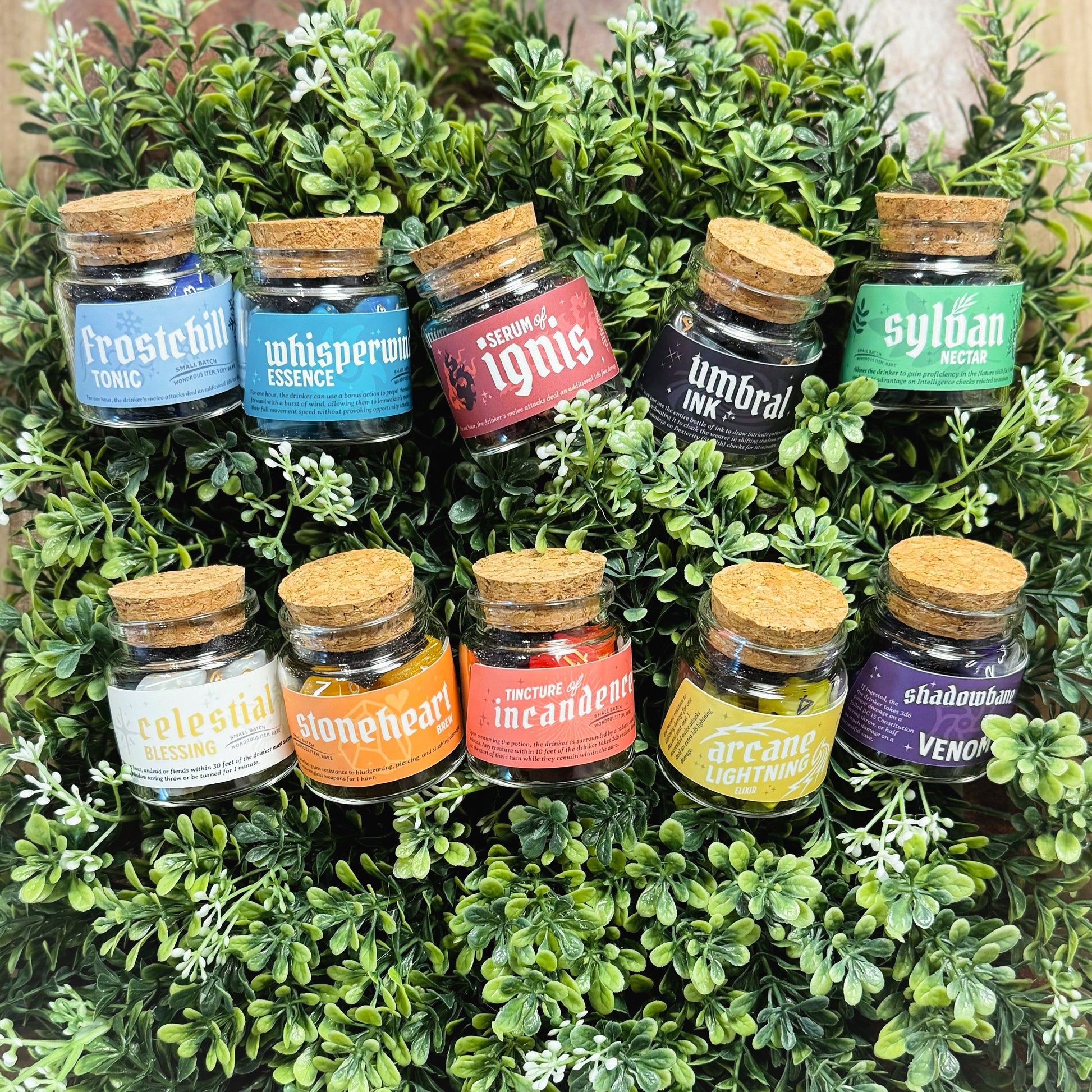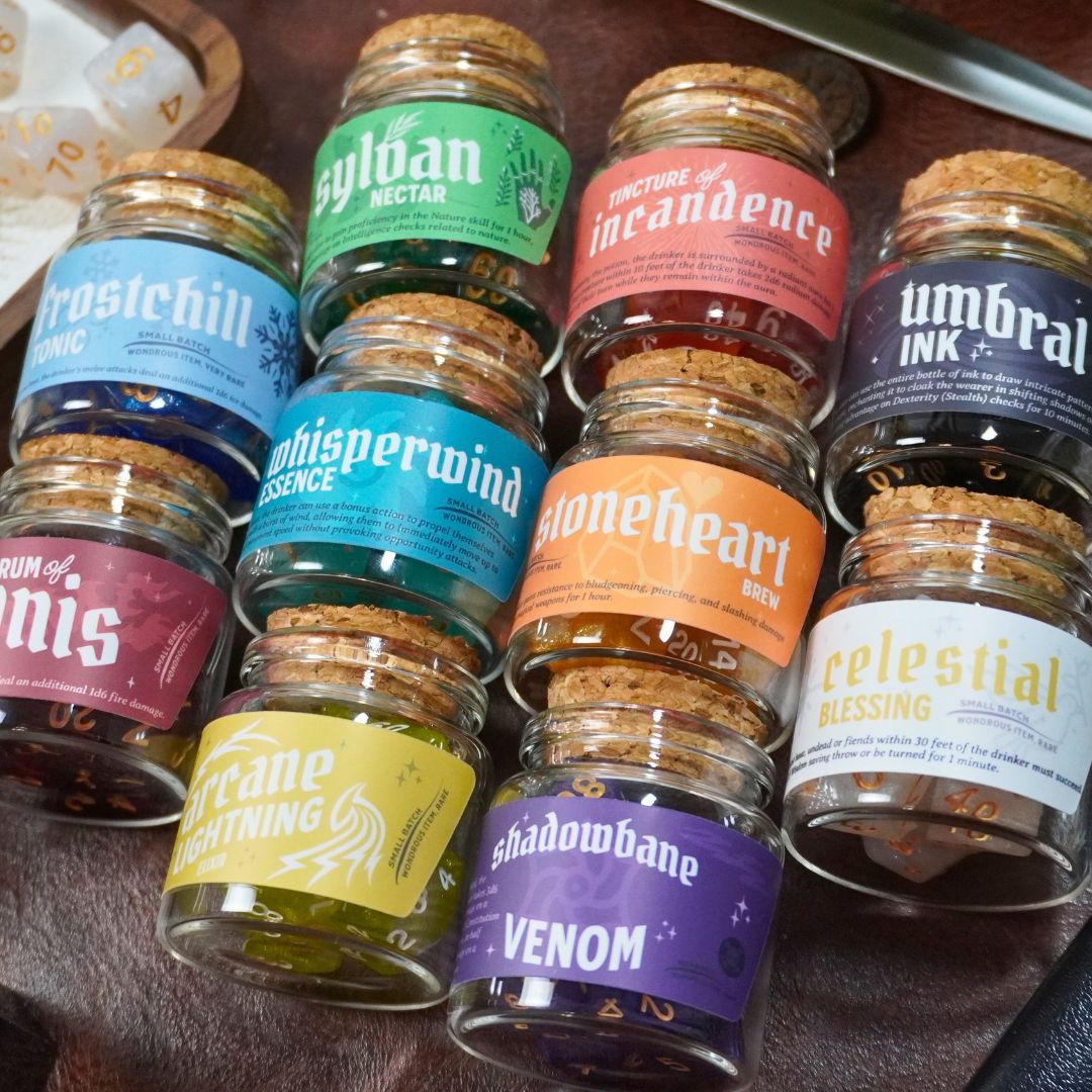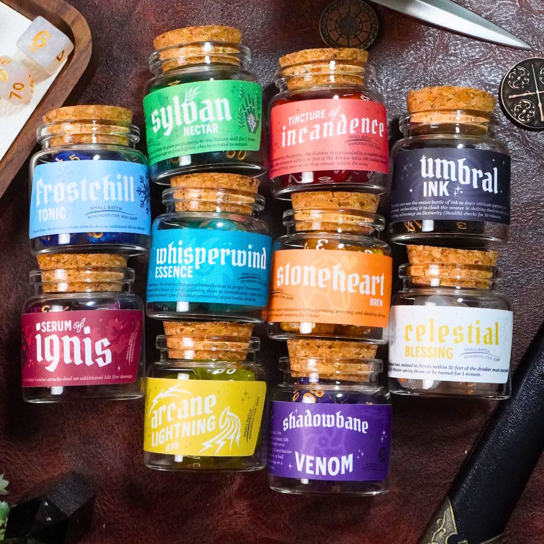 Our Dice Spell Bottle Set contains your choice of dice in a beautiful corked glass bottle! Each label has a uniquely designed label that matches the color dice you choose with an actual D&D spell/potion effect you can use in game, pending your Dungeon Master's Approval of course! Add to your collection of dice for games like Dungeons & Dragons, Pathfinder, and other tabletop RPGs. Each bottle includes the standard 7 dice array - D4, D6, D8, D10, D%, D12, and D20. Each glass bottle has a custom-designed Potion label. This makes a great gift for a friend or for yourself!