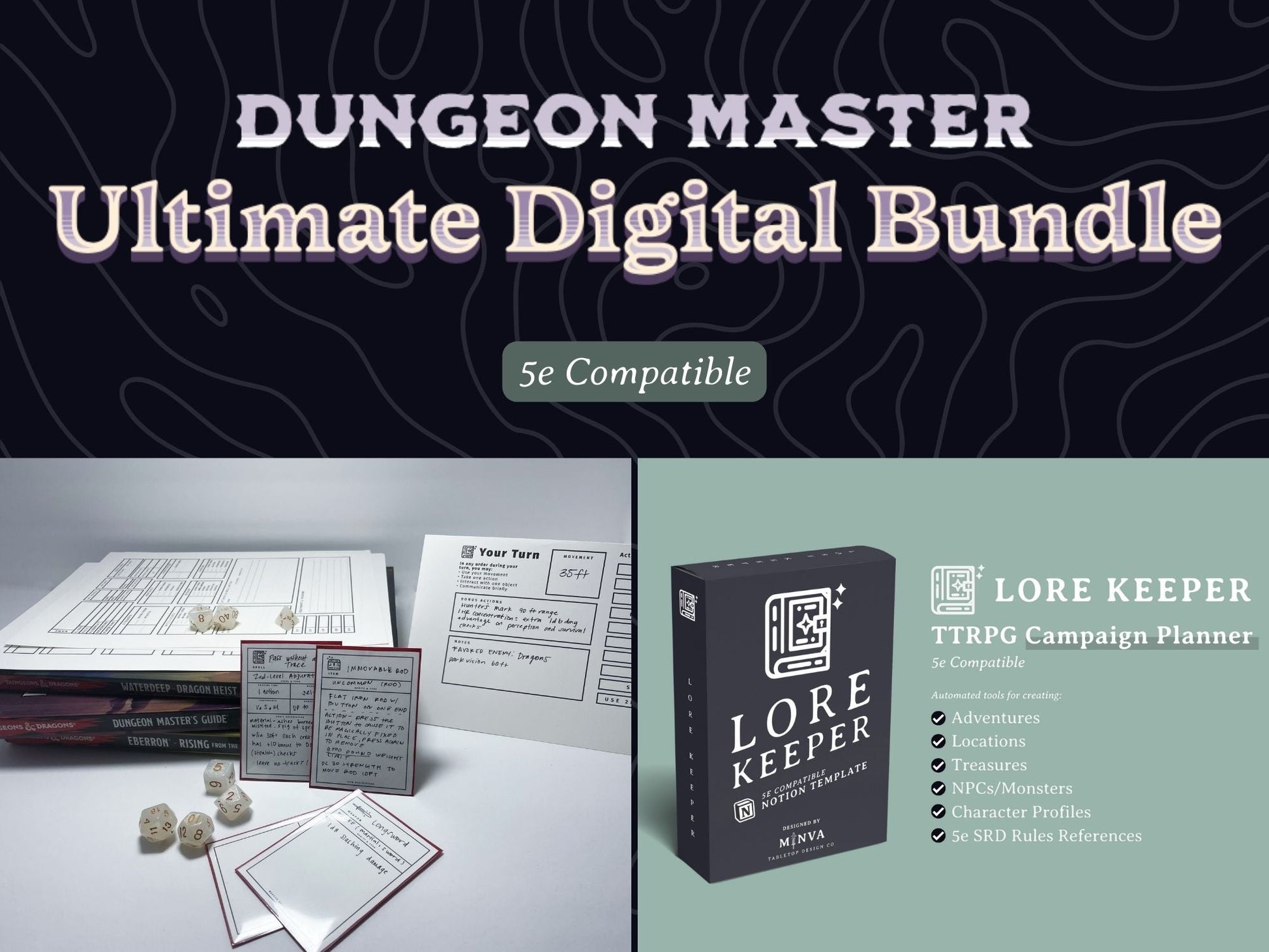 This Dungeon Master (DM) Ultimate Digital Bundle for D&D 5e is the perfect way to get started with your Dungeons and Dragons 5e campaign. Get all the fillable PDF worksheets and digital tools you need with this bundle, including our D&D Printable Sheets and Lore Keeper 5e Notion Template. Get everything you need to create your own unique campaigns both on the table and digitally! Get a significant discount of over 50% off by getting our bundle.