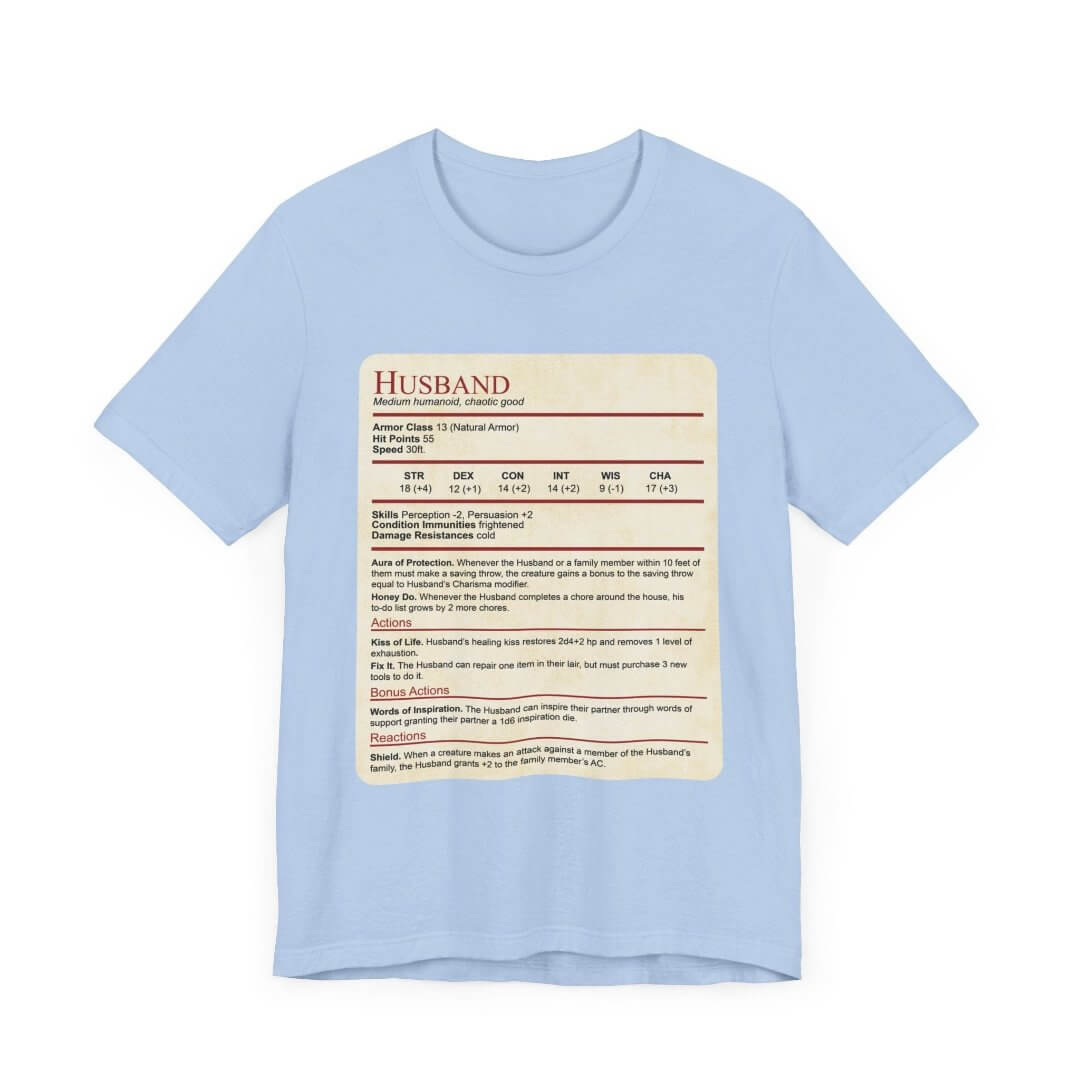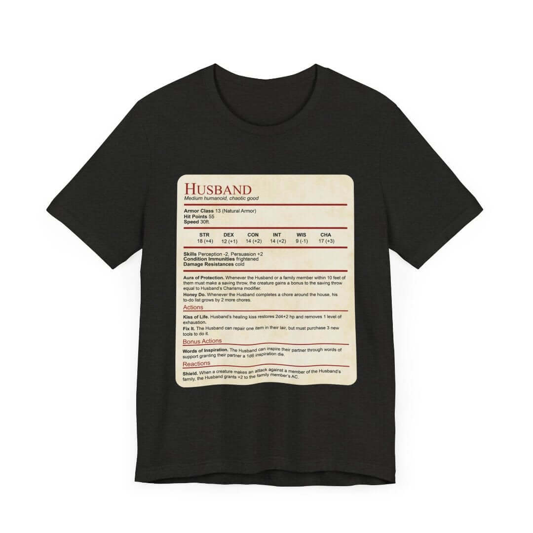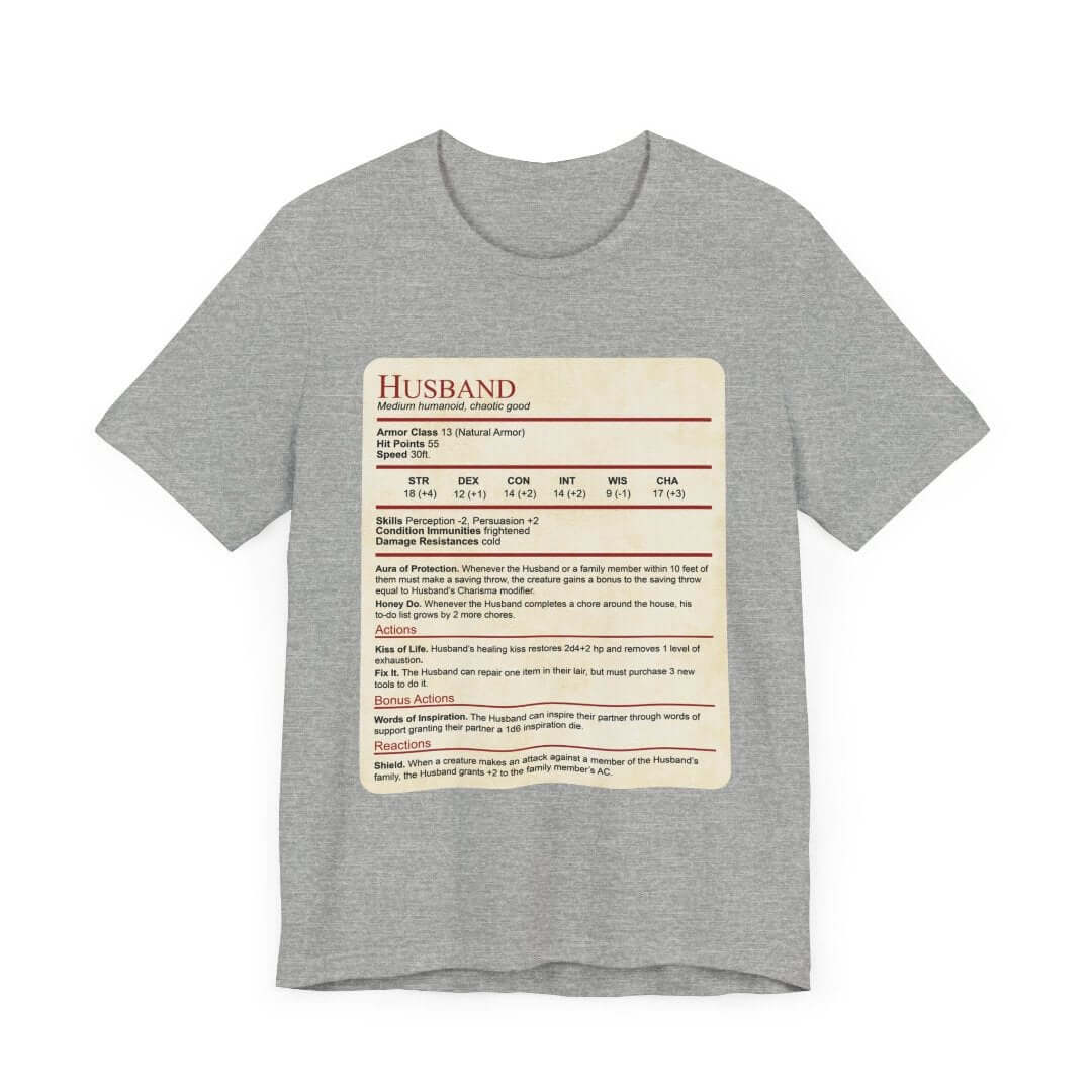 Introducing our latest t-shirt designed for Dungeons & Dragons loving spouses: the "Husband Stat Block" t-shirt! It makes for the perfect Valentine's Day, anniversary or wedding gift for the D&D loving husband in your life.