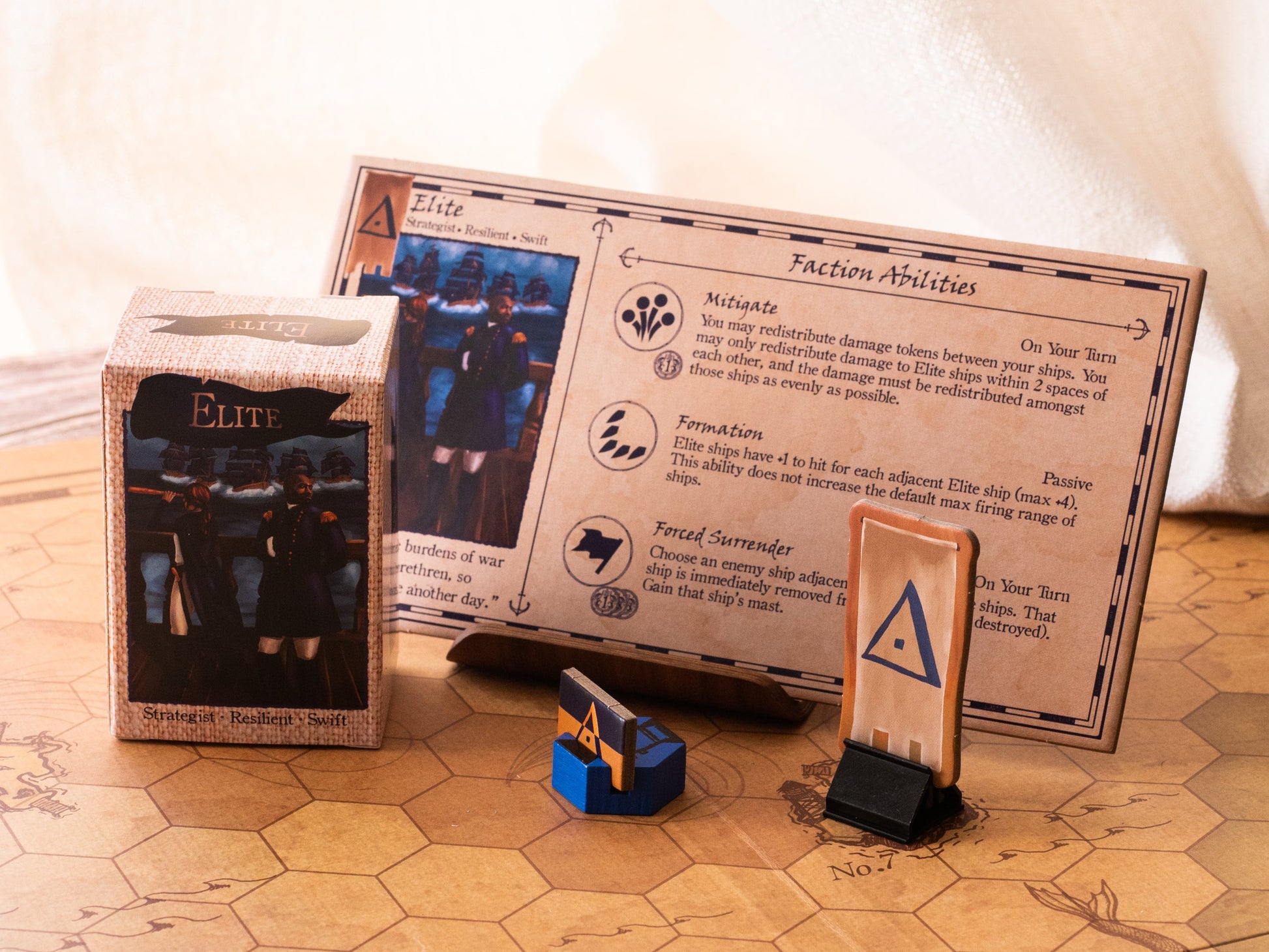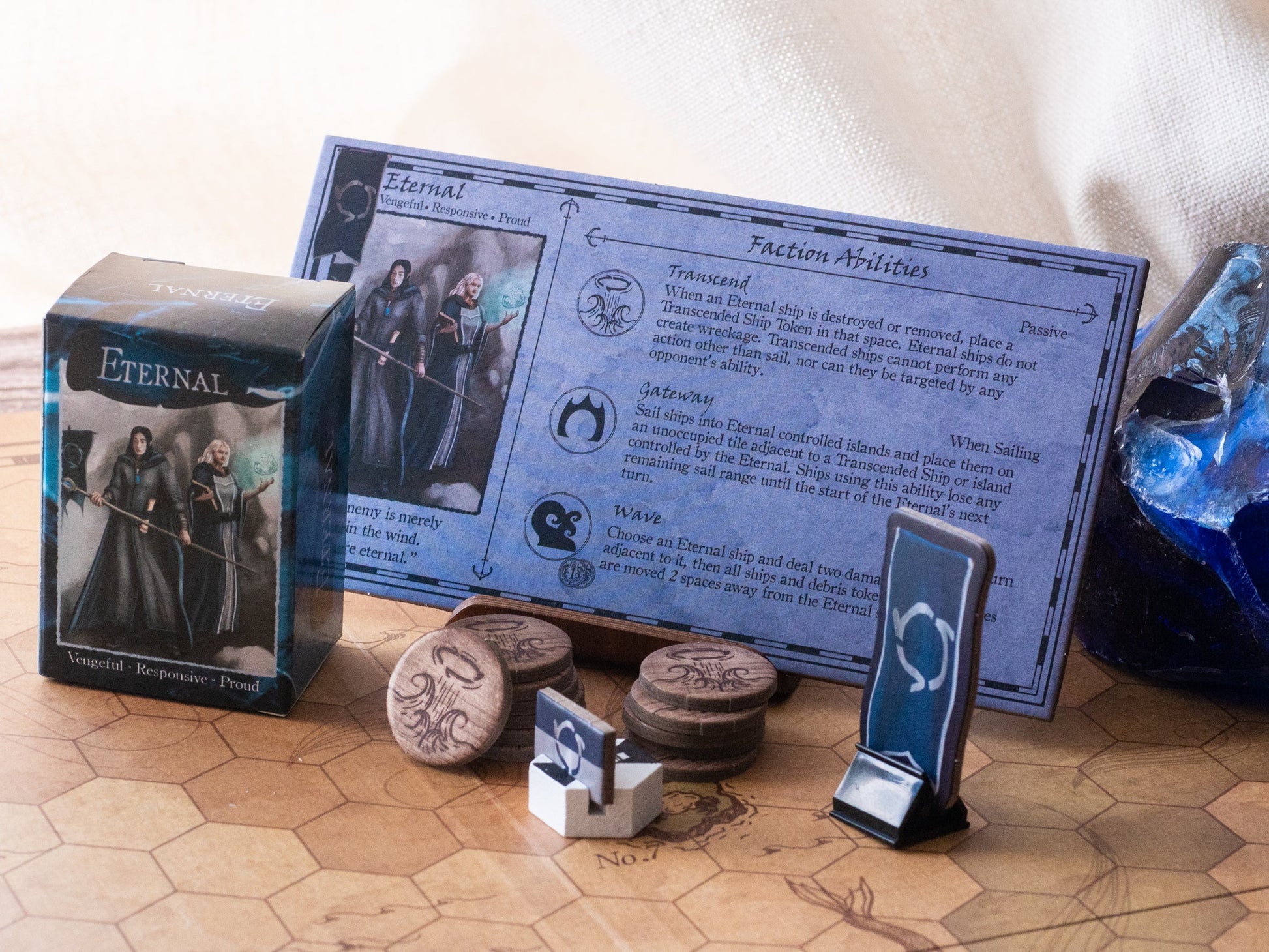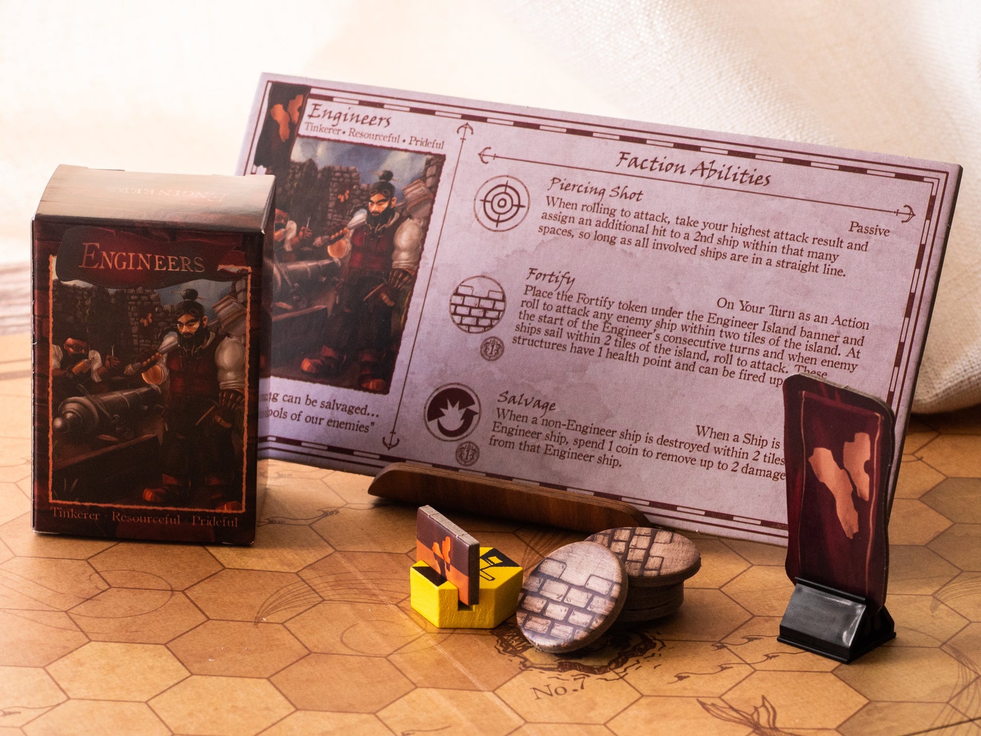 Pick your battles carefully; there are no reinforcements to look forward to. Turn the tide of battle and pursue victory by firing cannons at the enemy, sailing ships into positions of strength, seizing islands to expand your control of the sea, and making use of powerful faction abilities. The first player to capture 6 islands or the last player with ships still sailing is victorious and pronounced the Old Salt.