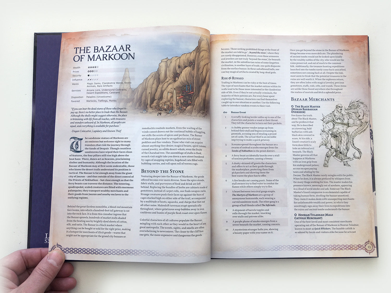 Remarkable Shops & Their Wares is the ultimate inspirational sourcebook to create and roleplay fantastical shops. A richly illustrated book, featuring eight ready-made and remarkable shops to use in any campaign world. Complete with staff NPCs, items, and exciting quest hooks. This is the sequel to our best-selling Remarkable Inns