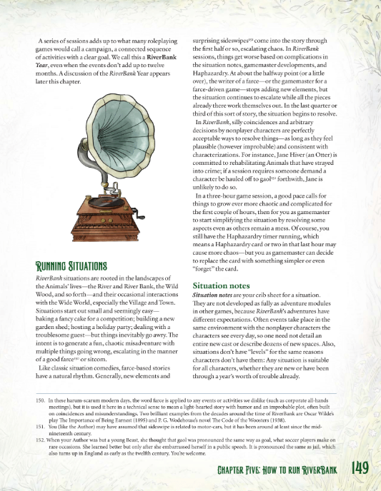 Welcome to the RiverBank Roleplaying Game! In this cozy narrative game of Animal characters, social adventures, and more than a few unexpected twists, you and a few reputable (or otherwise!) Animal friends will find a new home in an idyllic English countryside setting created by award-winning writer Kij Johnson.