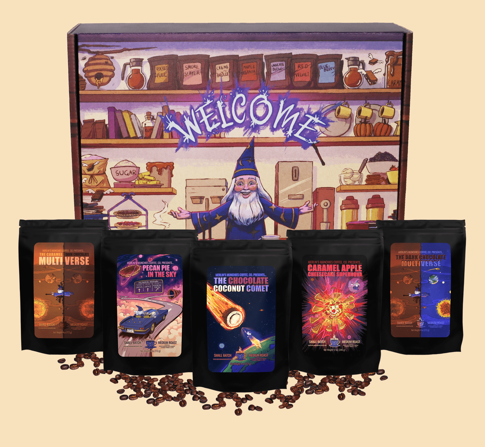 Experience space the way you never have before! Merlin's Space Bundle Box has flavors that will catapult you into another dimension! Venture deep into the Multiverse or experience a Caramel Apple Cheesecake Supernova explosion. Feel free to take the Pecan Pie Portal to the Pecan Pie in the sky. Want more??... Well, there's a Chocolate Coconut Comet hurling towards Earth! Merlin Help!