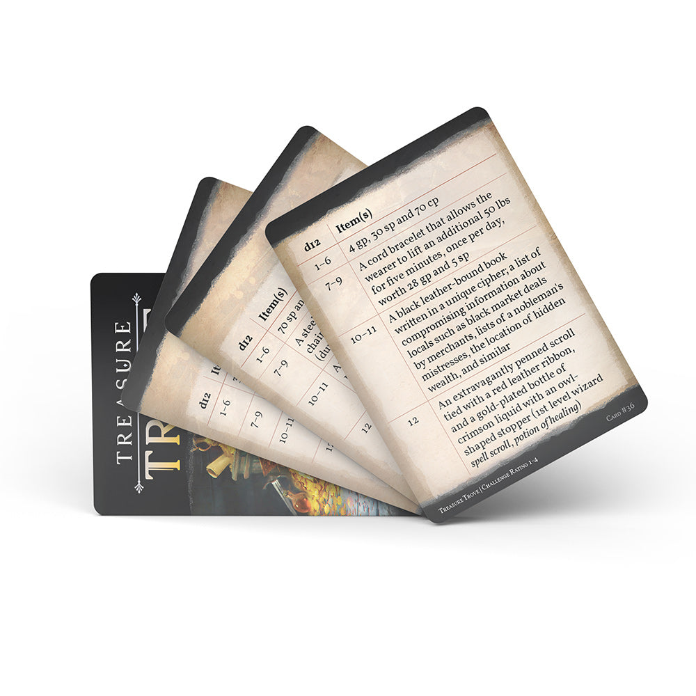 There are five decks in total, and there are 52 cards per deck. Each deck is intended to be used to generate random loot drops and treasure rewards for different level encounters. Each card has a d12 roll with 4 results that vary in rarity and value. Take your tabletop RPG to the next level and order yours today.