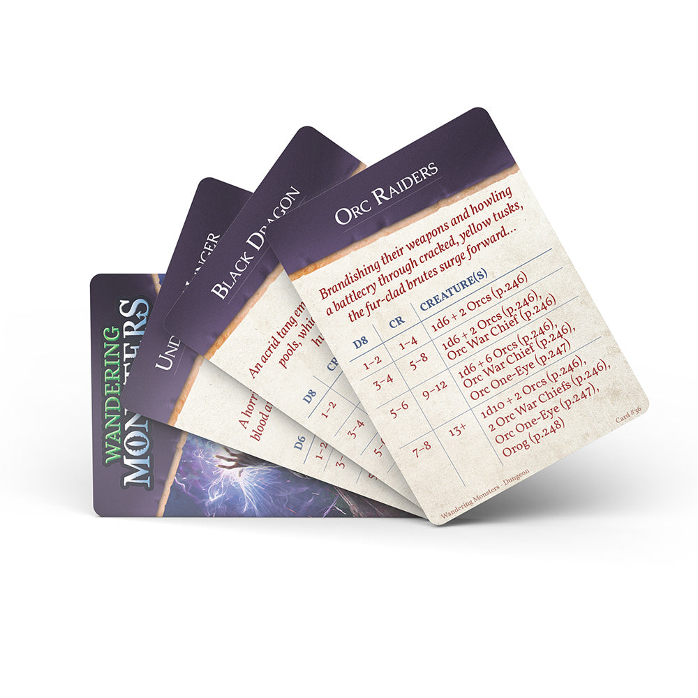 This deck contains 52 cards, each with 3-5 possible encounters for dungeon environments for 5th Edition. The encounter can be chosen based on the appropriate challenge rating, or roll a die to leave the experience to chance. Save yourself hours of setup time and challenge your players with monsters you never thought to use!