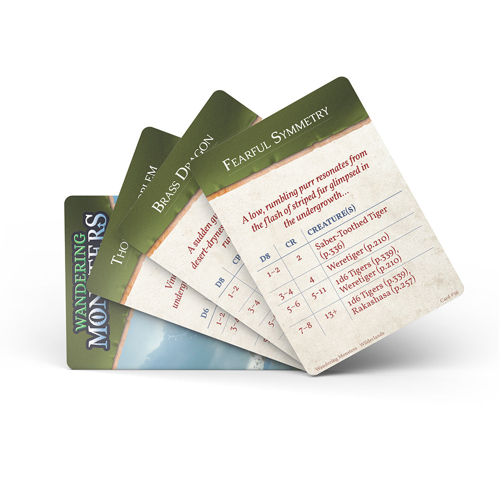 Are you looking to make your exciting top role playing games more exciting and more engaging? If so, we urge you to consider adding the Wandering Monsters Deck: Wilderlands (5E) to your Game Master’s Toolbox. Featuring 3-5 encounters per card with adjustable challenge ratings, this 52 card deck is sure to not disappoint. Order your expansion deck today to create exciting stories tomorrow!