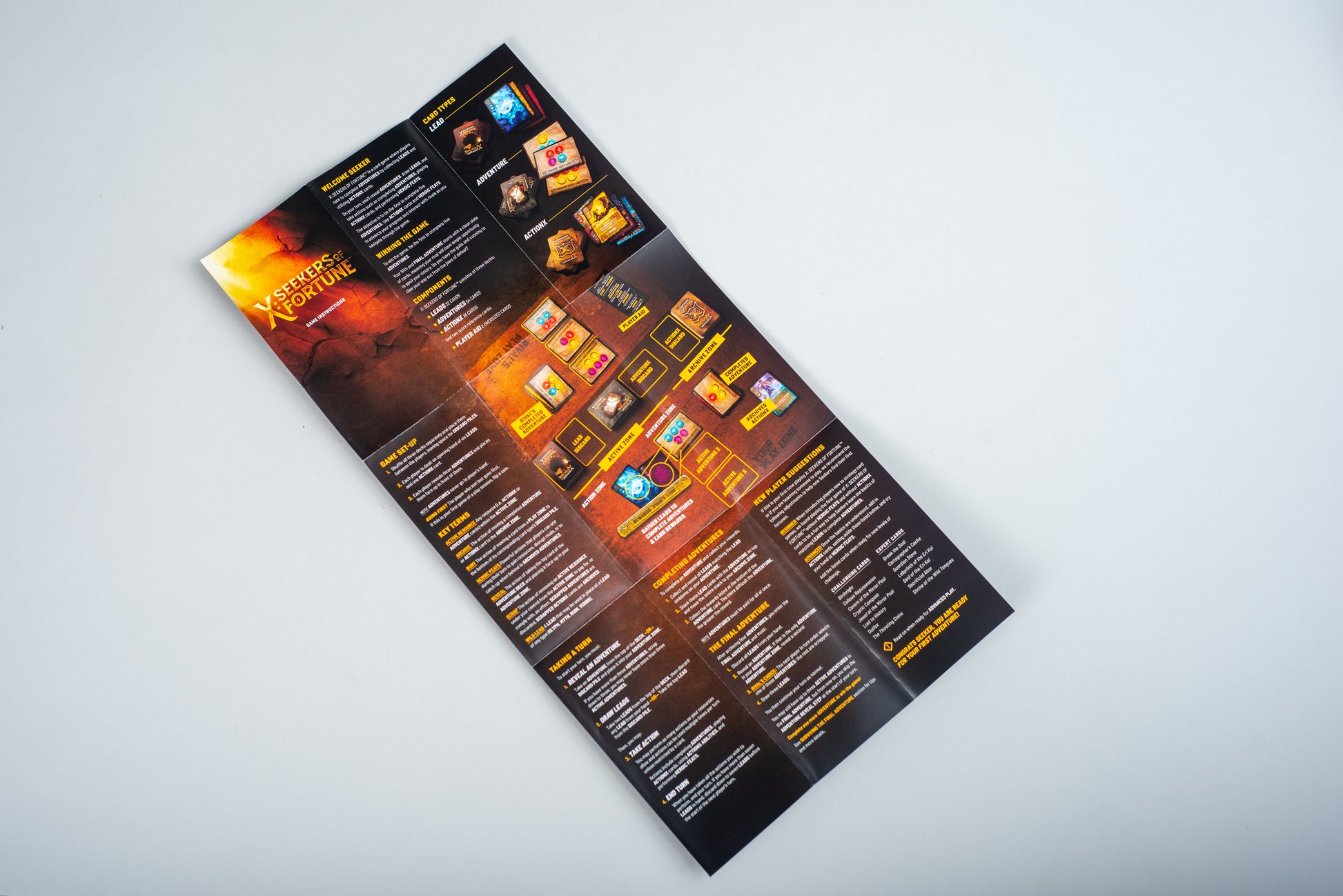 162 beautifully designed cards (72 Leads, 54 Adventures and 36 ActionX cards)